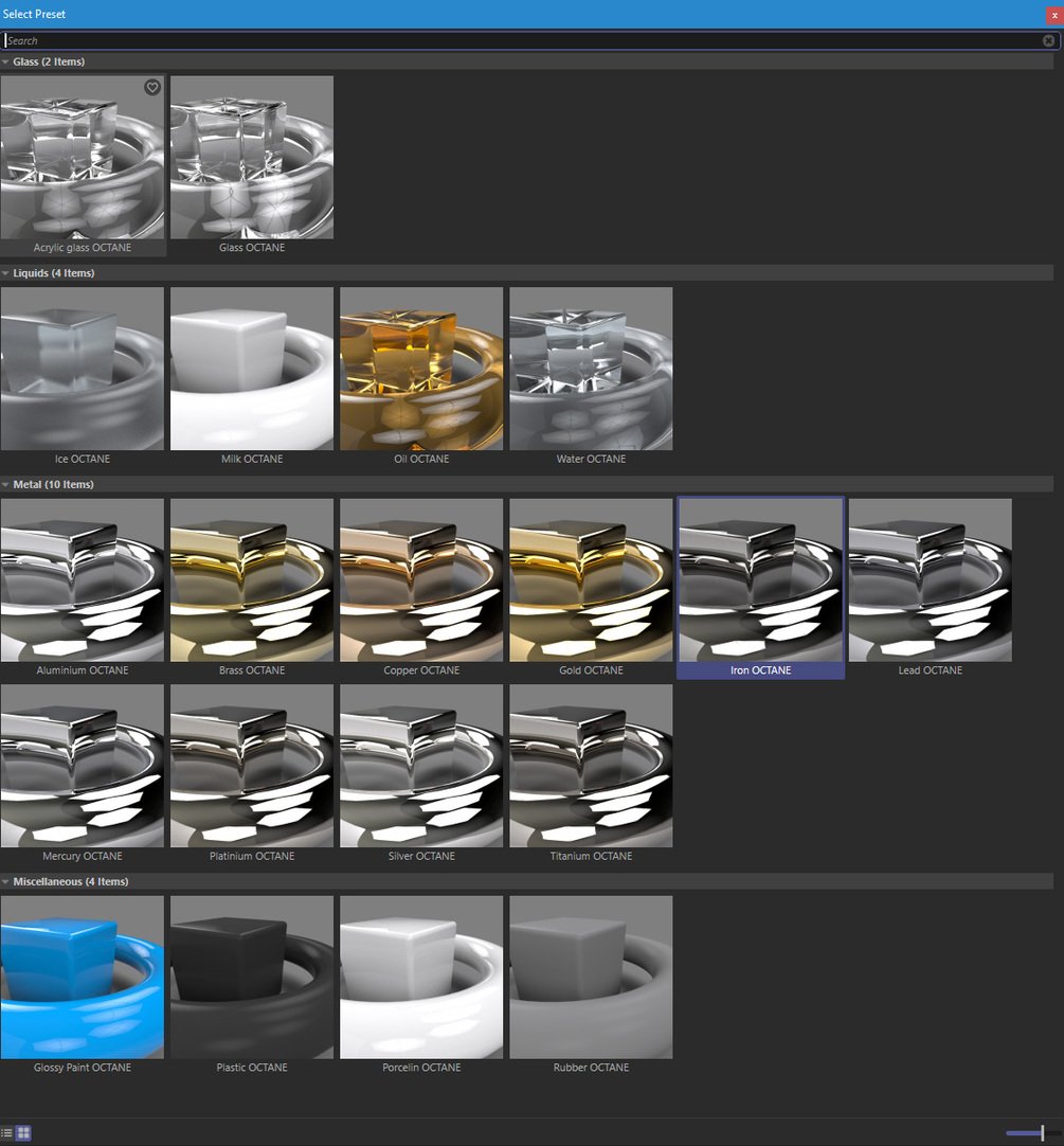 Thanks to Maxon for the great R25 Release with the new Userinterface. This allow us to make Presets for so many things. And it allow us also to make Material Presets for Octane now. This is a small library of presets for Octane Materials. Most metallic presets with complex IOR and a handful simple Materials like glas or plastic.